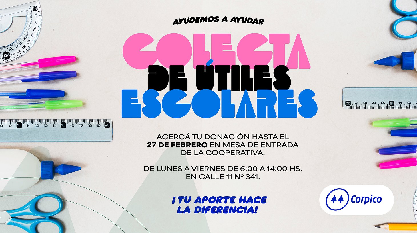 Corpico invita a la comunidad a sumarse a su colecta solidaria de útiles escolares. Las donaciones, que pueden ser útiles nuevos o usados en buen estado, se recibirán hasta el 27 de febrero en la Mesa de Entrada de la Cooperativa, calle 11 Nº 341, en el horario de 6:00 a 14:00 hs.